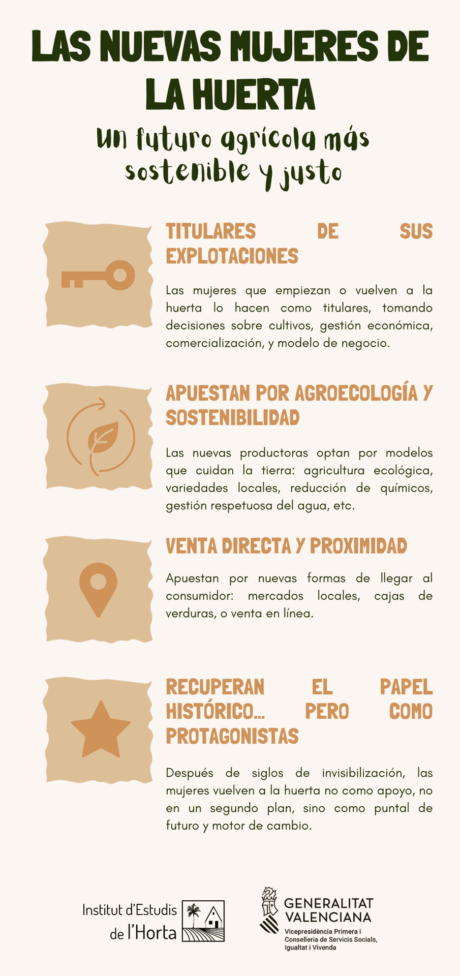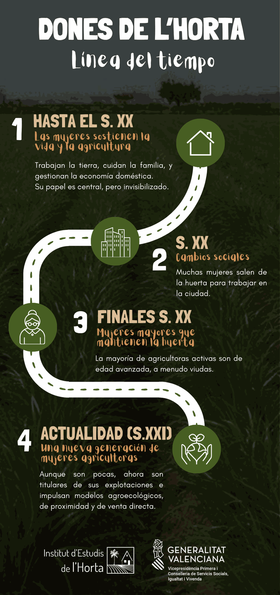 Esta infografía resume, de forma visual y sencilla, la evolución del papel de las mujeres desde la huerta tradicional hasta la actualidad. Muestra cómo su trabajo ha sido durante siglos esencial pero invisibilizado, y cómo hoy vuelven a ocupar un lugar protagonista en la agricultura valenciana.