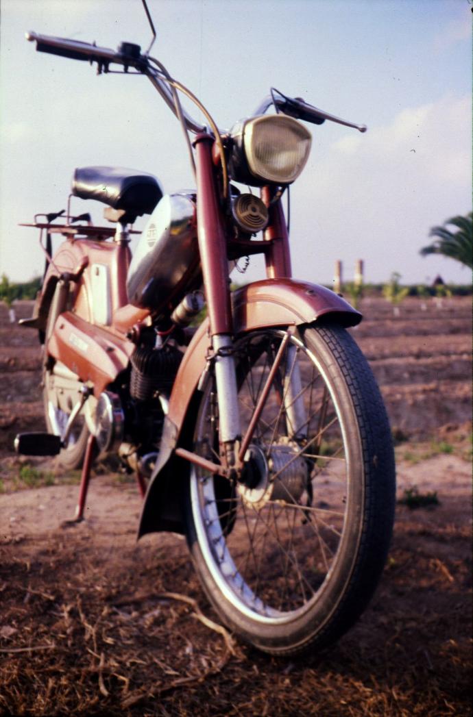 Esta es una de las primeras fotografías que tomé en mi vida. Todos los días volvía del colegio Sagrado Corazón de Godella por la huerta, con mi bicicleta. Estas vueltas a casa fueron el comienzo de muchos pensamientos, de muchas aventuras. En estos trayectos fui experimentando a lo largo de mi adolescencia casi de todo. Lloré, me di besos, robé, hice amigos, me enfadé. En una de esas que estaba robando unas naranjas de un campo, el agricultor me vió. En lugar de enfadarse me regaló una bolsa de naranjas y me dijo que la próxima vez se las pidiera. Esta era su moto, una Mobylette antigua. Un vehículo que te permite desplazarte, pero te obliga a ir despacio, a pensar las cosas dos veces.