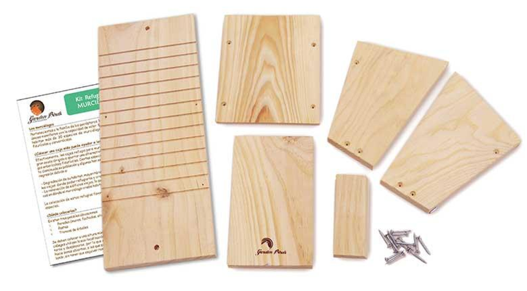 El kit educativo para la construcción de la caja nido para murciélagos se compone de los trozos de madera de pino macizo necesarios para su montaje, así como los tornillos necesarios y un folleto explicativo con las instrucciones de montaje y la descripción de las especies que pueden ocupar la caja nido.